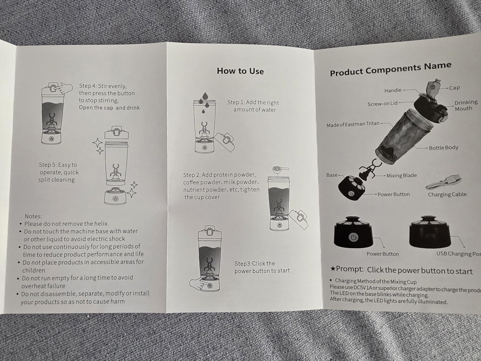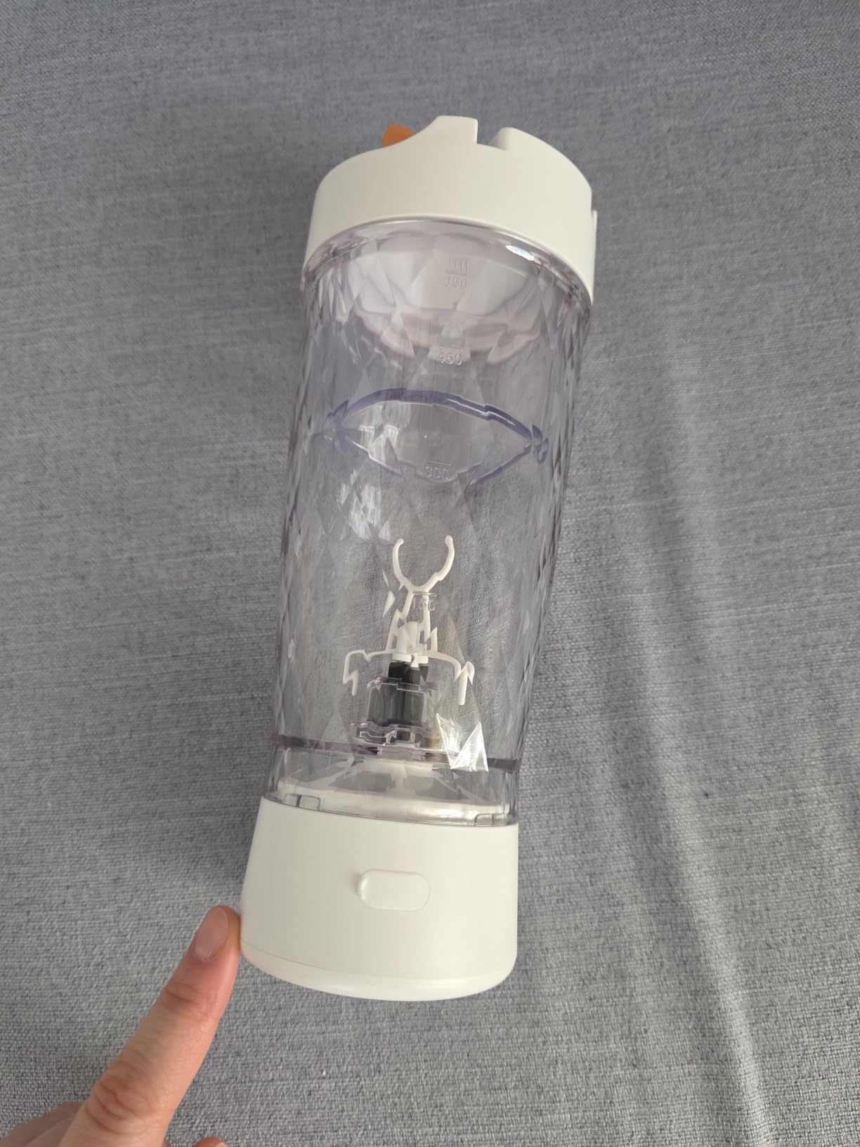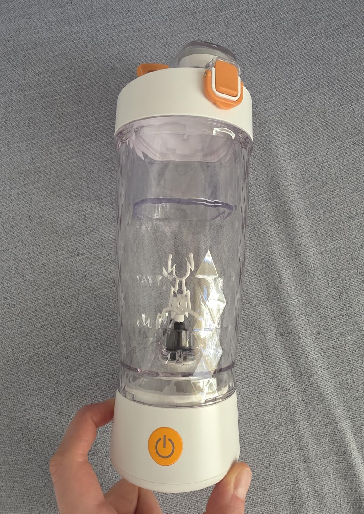 Dieser elektrische wiederaulfadbare Protein Shaker ist sehr gut verarbeitet und sieht mit dem Rautenmuster sehr gut aus. Es wirkt wie Glas, ist aber natürlich Kunststoff BPA frei. Das Rautenmuster ist von außen, innen ist der Becher glatt. Die bunten Lichter während des Mischvorganges sind sehr hübsch anzusehen und fallen ins Auge.Der Mixbecher hat noch zusätzlich einen herausnehmbaren separaten kleinen Behälter für Proteinpulver, Vitaminpulver, etc., was man so leicht für unterwegs mitnehmen kann.Der Protein Shaker arbeitet mit Deckel sehr leise, man hört ihn, ist klar, aber er ist nicht störend laut. Ich mixe mir damit meine Vitamindrinks mit Joghurt und etwas Wasser. Zuerst fülle ich die Flüssigkeit ein und schalte ihn dann ein und gebe während des Mixens das Pulver hinzu, das ist zwar laut, dafür brauche ich aber nur einen Mixvorgang, da sich das Pulver so ideal verteilt. Gebe ich das ganze vorher rein und schließe den Deckel und starte dann den Mixvorgang, brauche ich zwei Durchgänge, bis das Pulver richtig verrührt ist. Beides ist gut machbar und liefert sehr gute Ergebnisse.Ich bin sehr zufrieden und kann diesen Protein Shaker auf jeden Fall weiterempfehlen.