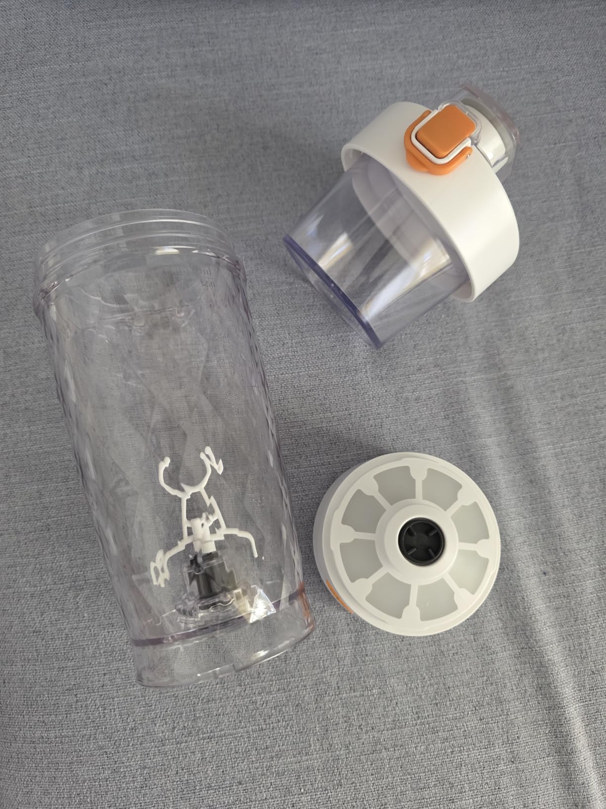 Auf den ersten Blick dachte ich mir, dass dieses Gerät nicht nur irgendwie merkwürdig aussieht mit seinem stark strukturierten Becher, aber auch, dass der kleine Mixstab aus Plastik niemals genug Power aufbringen wird, um 400-450ml Flüssigkeit mit 30-35g Pulver ordentlich zu vermengen.Der erste Versuch hat allerdings gleich das absolute Gegenteil bewiesen!Oben besagte Menge eingefüllt und den Mixvorgang mit einem Knopfdruck gestartet. Erst dachte ich, dass das Gerät einen Timer hat und irgendwann von selbst aufhört, aber der Vorgang muss manuell gestoppt werden - finde ich eigentlich gut, denn so kann ich selbst bestimmen, wie cremig mein Shake wird. Das Ergebnis: alles perfekt gemischt, keine Klumpen und sogar cremig. Ein manueller Shaker und auch mobile Geräte mit richtigen Messern drin, schaffen das teilweise nicht so gut.Die Reinigung ist ebenfalls super einfach, denn der Motor mit Akku kann einfach abgedreht werden und der restliche Behälter plus Deckel kommen in den Geschirrspüler. Laut Hersteller sind die Teile bis 100°C resistent und das dürfte so auch stimmen - zumindest hat sich auch nach mehreren Spülgängen nichts verbogen.Der Becher bzw. der ganze Mixer ist allgemein sehr Stabil. Das liegt vermutlich auch an der Struktur, die optisch zwar etwas gewöhnungsbedürftig ist, aber so durchaus ihren Zweck erfüllt.Nett mitgedacht: es wird noch eine kleine Dose zur Aufbewahrung einer Portion Proteinpulver mitgeliefert.Was mir nicht ganz klar ist: warum wurden bunte LED-Lichter im Motor verbaut? Diese leuchten random in verschiedenen Farben während des Mixvorgangs auf, machen aber einfach keinen Sinn. Heutzutage muss wohl alles irgendwie leuchten können, um in den Verkauf gehen zu dürfen. Meiner Meinung nach sinnlos, aber solange es nicht stört, soll es eben da sein und deshalb auch ohne Abzug von Sternen.